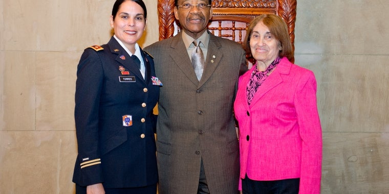 Senator Díaz (c) welcomes Major Jacqueline Torres (l) and Mrs. Josefina Torres (r) to the New York State Capitol for the Women Veteran's Recognition Luncheon, June 11, 2014
