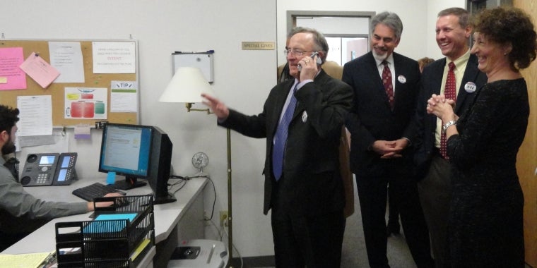 State Senator John A. DeFrancisco is pictured at the 2-1-1 Call Center in East Syracuse, after a press conference on February 6, 2015, to kick off the new system in Onondaga County. Residents of Onondaga County can now find a variety of resources by dialing a simple three-digit number, 211.