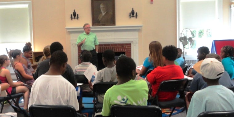 Senator John A. DeFrancisco was a guest reader at White Branch Library in Syracuse on August 6, 2015. Senator DeFrancisco read to the children, handed out edudational coloring books, and answered several questions about his job as Senator and about New York state government.