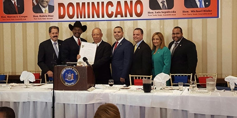 Senator Rubén Díaz with his Honoree Mr. Calazán Omar Cepeda at the "Abrazo Dominicano Banquet” and Congressman José Serrano, Assemblymen Marcos Crespo and Luis Sepulveda, NYS Commissioner Arlene Gonzalez-Sanchez and Assemblyman Victor Pichardo