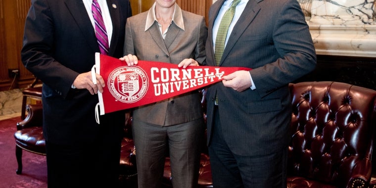 Albany, N.Y., April 28—Cornell University President-elect Elizabeth Garrett visited the state capital today to meet with Senate and Assembly leaders as an introduction to her upcoming tenure, to help celebrate the occasion of Cornell’s 150th anniversary, and to discuss the university’s future and how its mission intersects with New York State’s overall economic and educational goals.