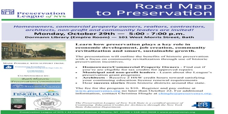The PLNYS “Road Map to Preservation” presentation is open to homeowners, commercial property owners, realtors, contractors, architects, non-profit, and community leaders interested in learning how preservation plays a key role in economic development, job creation, community revitalization, and smart, sustainable growth.