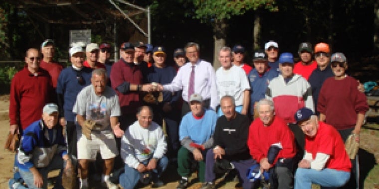 New York State Senate Deputy Majority Leader Dean G. Skelos (R-Rockville Centre) met with the "Boys of Summer" senior softball team to view the newly cleaned ball field at Hempstead Lake State Park. Through the efforts of the team’s organizer, Bob Simmons, the New York State Office of Parks, Recreation and Historic Preservation restored the neglected softball field at Hempstead Lake State Park.