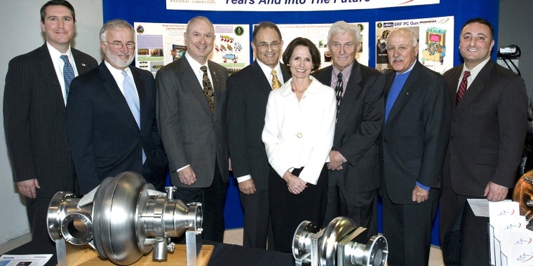 Officials from several levels of government and principals from Advanced Energy Systems, Inc. (AES) and Brookhaven Lab gathered at AES headquarters in Medford on Friday to celebrate a new partnership that will lead to advanced technology in superconducting materials. Attending were, from left, Brookhaven Town Supervisor Mark Lesko, U.S. Congressman Tim Bishop, BNL Project Leader Ilan Ben-Zvi, Lab Director Samuel Aronson, Empire State Development Corporation Director Andrea Lohneiss, AES President/CEO Tony Favale, State Senator Kenneth P. LaValle, and State Assemblyman Marc S. Alessi.