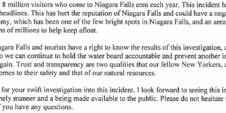 State Senator Rob Ortt sent a strongly worded letter to the DEC Commissioner calling out the Niagara Falls Water Board for initially blaming the black water on a routine maintenance issue. The letter also calls on the Commissioner to release the results of the DEC's investigation in a timely manner so the Water Board can be held accountable.