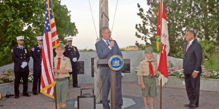It was sunny and warm on Wednesday, but there was a slight breeze, too, that made the American flag furl in the pre-dusk sky. The annual Sept. 11 Memorial Ceremony in Oyster Bay was heartfelt, sprinkled with hometown moments that included patriotic music by the Oyster Bay Community Band, somber local veterans leading the Pledge of Allegiance and scouts of all ages placing roses and miniature flags next to the plaques bearing the names of the local victims.