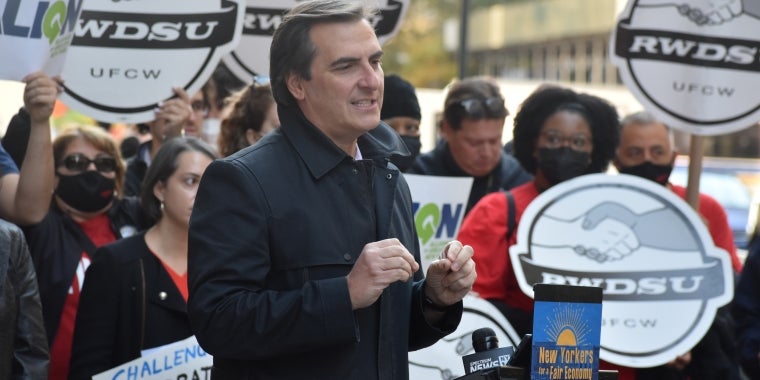 “We know that history cannot repeat the way that it did back in the Gilded Age. We’re living in another one now. And it’s incumbent on us to pass legislation that really tipped the scale in favor of the workers,” state Senator Jessica Ramos said. “Jeff Bezos is laughing up in space while his workers are fighting to put food on the table. Elon Musk is trying to follow him out in space while we’re working, while we’re fighting to make sure all workers get guaranteed housing.”