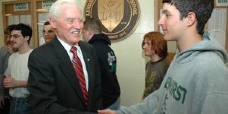 State Senator Owen H. Johnson (4th Senate District, Babylon), Chairman of the Finance Committee, is shown speaking with one of Lindenhurst High School’s Champion Bowlers following a special ceremony at the high school where the Senator presented the team with a New York State Senate Resolution honoring them for capturing the state title. Lindenhurst’s Varsity team competed in Syracuse in March where they beat Niagara Falls High School and won the state championship. This is the first time in history that the bowling team has won the state title.