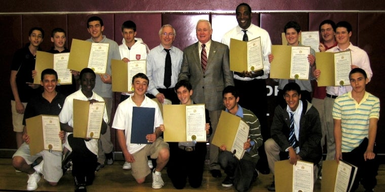 New York State Senator Martin J. Golden visited Bay Ridge Preparatory School on Friday, May 1, to give special recognition to the school's championship junior varsity boys basketball team. In celebration of the team's victory in the championship game of the Private School Athletic Association in February, Senator Golden presented a New York State Senate Resolution commending the team on their achievements.