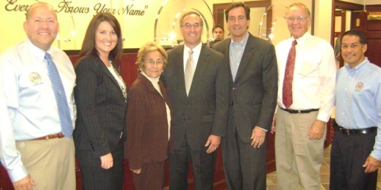 Senator Fuschillo (third right) is pictured as he congratulates First National Bank of Long Island President Michael Vittorio (center) and Branch Manager Julie Freund (second left) on the grand opening of their new Bellmore branch. They are joined by (l-r) Councilman Hudes, Councilwoman Cullin, Assemblyman McDonough, and Town Clerk Bonilla.