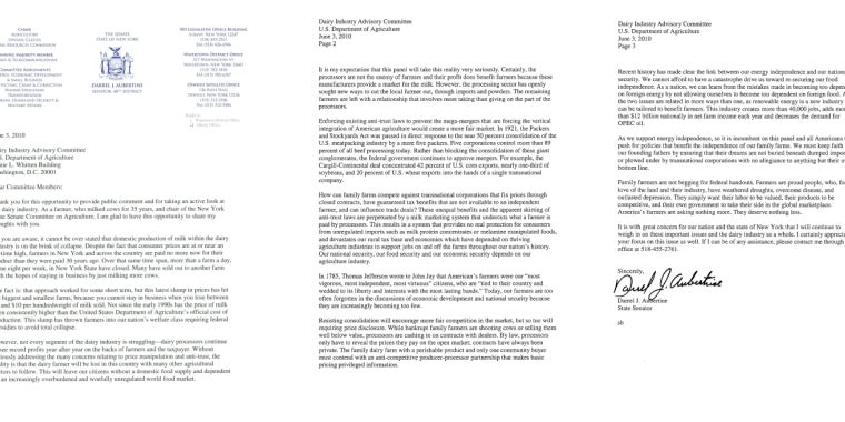 WASHINGTON, D.C. (June 3, 2010)—State Sen. Darrel J. Aubertine today submitted comments to the U.S. Department of Agriculture’s recently created Dairy Industry Advisory Committee stressing the need to address vertical integration in the industry, anti-trust concerns, and the risks of dependence on foreign food.