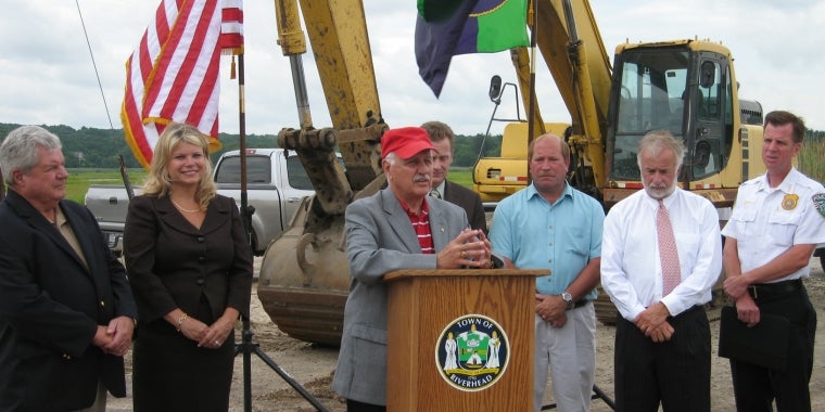 (l-r) Riverhead Town Trustees, John Dunleavey and Jodi Giglio, Senator Ken LaValle, Supervisor Sean Walter, Riverhead Town Trustee James Wooten, Congressman Tim Bishop, and Riverhead Town Chief of Police David  Hegermiller