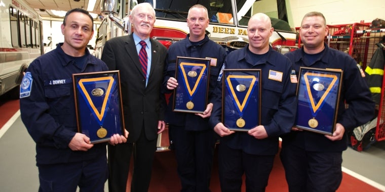 The Award Ceremony took place at the Deer Park Fire Department on Thursday, March 4, 2010. Those honored were Richard Andersen of Bohemia, Detective, NYPD Emergency Services Unit and Rescue Specialist, New York Task Force 1; Thomas Donnelly of Deer Park, Lieutenant, FDNY Rescue Company 1 and Search Team Manager, New York Task Force 1; Joseph Downey of West Islip, Battalion Chief, FDNY Rescue Battalion and Task Force Leader, New York Task Force 1; and William Reddan of Sayville, Lieutenant, FDNY Squad 252 and Technical Information Specialist, New York Task Force 1.