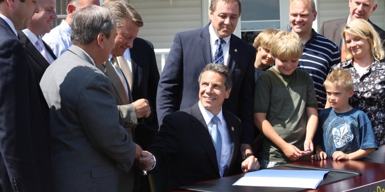 After signing the new property tax cap legislation into law today during a visit to Western New York, Governor Andrew Cuomo gave Senator George Maziarz, a strong advocate for tax relief, one of the pens he used to write his name on the document.