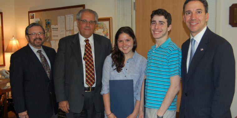 Senator Jack M. Martins visited the North Shore Hebrew Academy in Great Neck to congratulate Jonathan Michael Nachman and Sarah Jamie Toledano for being named semi-finalists in the Intel Science Talent Search.