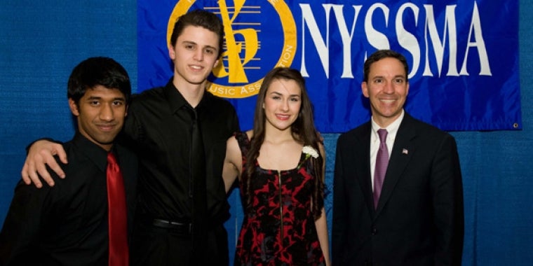 Senator Jack M. Martins attended the annual New York State School Music Association Concert at the State Capitol. During the concert, Senator Martins had the opportunity to congratulate local musical performers Christina Ames, Nicholas Olynciw and Nikhl Thomas. All three students attend local schools in the 7th Senate District. Ames attends Wheatley High School; Olynciw attends Floral Park Memorial High School and Thomas attends Clarke High School in Westbury. The concert featured outstanding musicians from throughout the state.