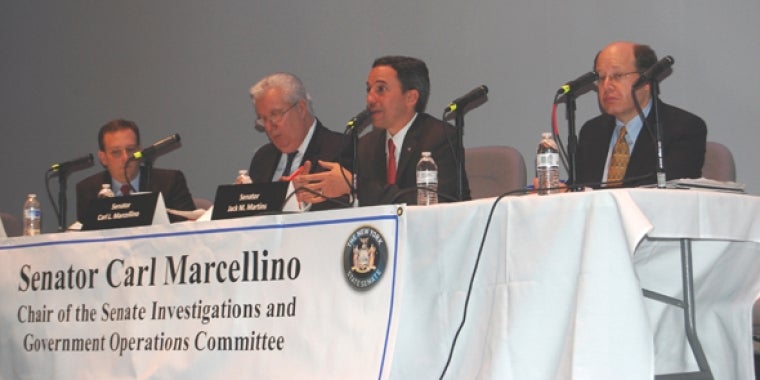 Senator Jack M. Martins participated in a hearing that addressed the MTA’s finances on Thursday, May 5. The hearing was held at SUNY Old Westbury. It was sponsored by the Senate Standing Committee on Investigations and Government Operations, chaired by Senator Carl Marcellino.
