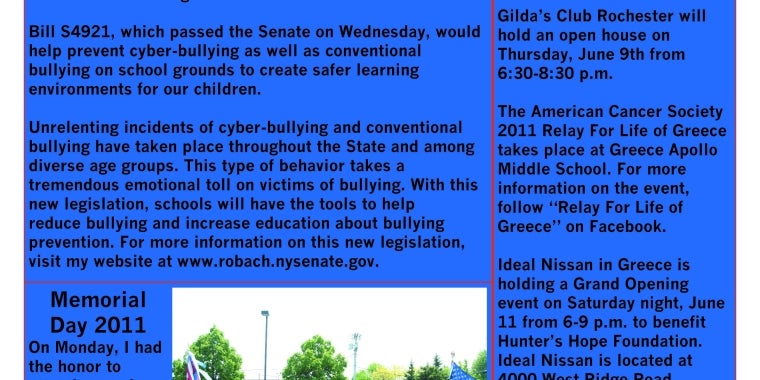 Here is a preview of Senator Robach's Community Connection for the week ending Sunday, June 5, 2011. Click on the link below to download a full-screen version. In this week's issue, the Senate passes anti-bullying legislation, the week ahead in the district, and a summary of this past week's events to honor Memorial Day.