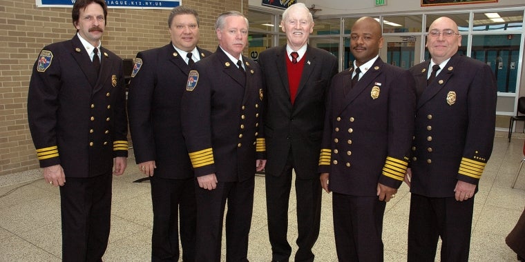 Photograph from left to right are: Daniel Campion Assistant Chief; Angelo Licata, Commissioner; Arthur Steigert, Commissioner; Owen H. Johnson, NY Senator; Julian Wellington, Chief; and Peter Sayevich, Chairman of the Board of Fire Commissioners.