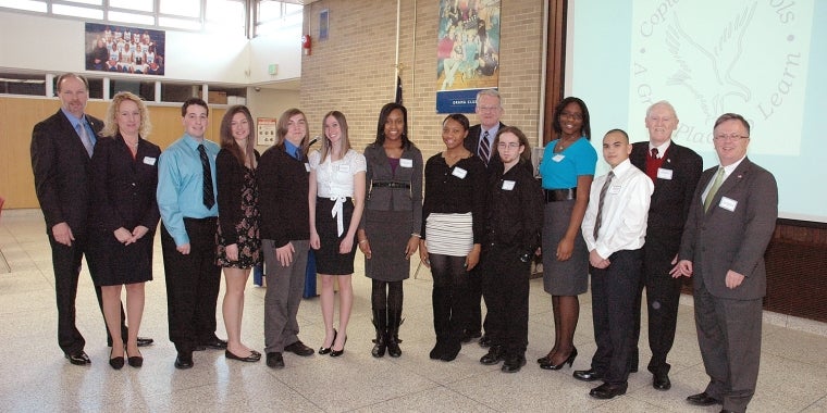 Photograph from left to right: Charles Leunig, Superintendent; Jeanette Altruda, Principal of the Walter G. O'Connell Copiague High School; Daniel Handy, Valedictorian; Emily Hall, Salutatorian; Jacob Ohrnberger; Nicole Mangels; Shanice McKenzie; Amber Perrier; Robert K. Sweeney, NY Assemblyman; Alex Attanasio; Stephanie Diegue; Alex Preda; Owen H. Johnson, NY Senator; and Wayne Horsley, County legislator. Top 10 Student Maxwell Woelk was unable to attend.