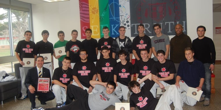 Senator Jack M. Martins visited the Wheatley School to congratulate the members of the boy’s soccer team who captured the Long Island Class B championship, the school’s first since 2004.