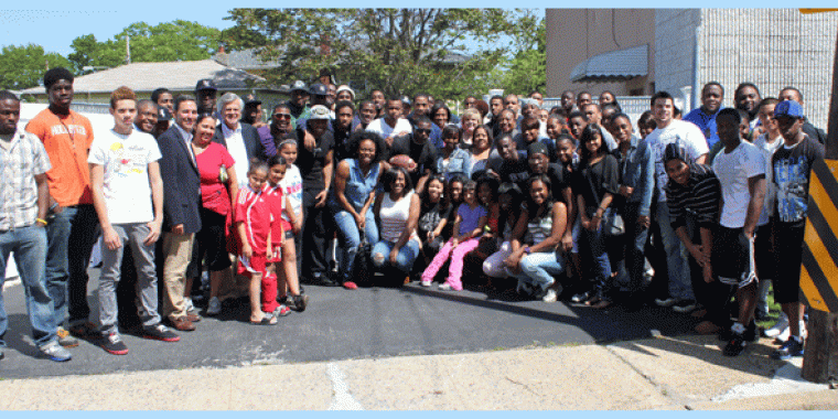 Photo Caption: Senator Jack Martins, State Senate Majority Leader Dean Skelos and the 3on3 Tournament Committee Announce the Elmont-Viscardi School Wheelchair Basketball Game starting squads this past weekend. Over 240 people attended the committee meeting announcement. The 3on3 tournament is tipping off July 14th at the Dutch Broadway School!