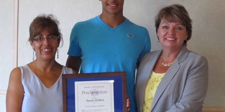 State Senator Patty Ritchie recently honored Austin DeMott, an Oswego High School grad for 13 years of perfect attendance.