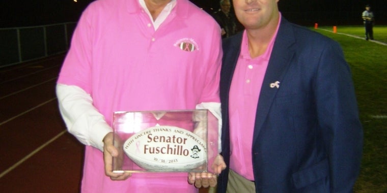 In recognition of his efforts, the school presented Senator Fuschillo with a football signed by the entire Mepham High School football team. The ball was presented during Mepham’s “Friday Night Lights” game against Kennedy High School, where both teams went pink to raise awareness about breast cancer and funds for breast cancer research.