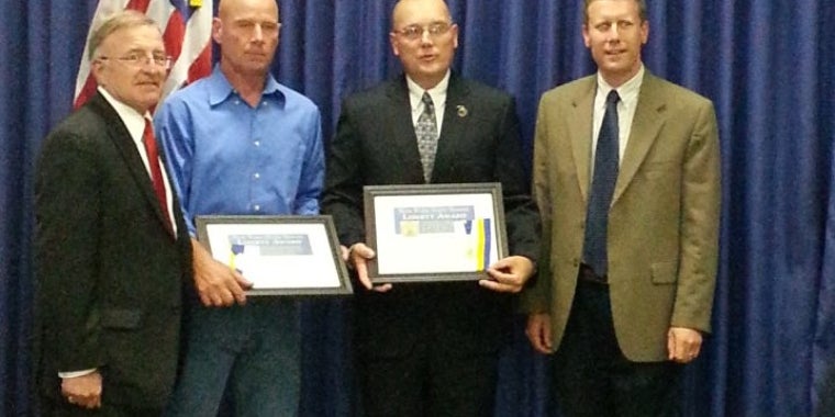 During an awards ceremony at the State Office Building in Syracuse, William Cregg of Cicero and John Harke of Clay were presented with the 2013 New York State Senate Liberty Award. The medal is given to those civilians who have exhibited exceptional, heroic or humanitarian acts on behalf of their fellow New Yorkers.