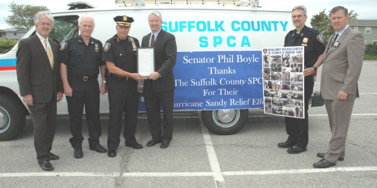 Lindenhurst, NY – Senator Phil Boyle (R-Bay Shore) honored the Suffolk County Society for the Prevention of Cruelty to Animals (SPCA) on Thursday, June 6, 2013 in recognition of the organization’s heroic and exemplary efforts on behalf of pets and their owners in the aftermath of Superstorm Sandy. The event took place at the SPCA on Shore Road Park in Lindenhurst.