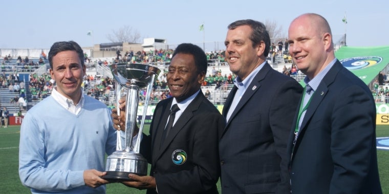 Senator Martins (left) is pictured with (l-r) Pele, NASL Commissioner Bill Peterson, and New York Cosmos COO Erik Stover.