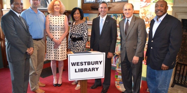 Senator Martins presented the Library with a copy of a legislative resolution he sponsored, which was passed by the New York State Senate, honoring the milestone. With passage of the legislative resolution, the Library’s 90 year history of service to the Westbury community will forever be part of the New York State Senate’s official record.