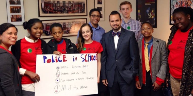 (Albany, NY)- Senator Serrano met with 7th and 8th grade students from the Manhattan Country School, who traveled to Albany to discuss current education policies. The students spoke with the Senator about the School to Prison Pipeline, a term used to refer to the current trend of the criminalization of students in schools, which often leads to them ending up in the juvenile justice system. The students discussed ways to put an end to this disturbing pattern that disproportionally affects minority students. They believe that increasing the number of guidance counselors and social workers in schools, while decreasing the amount police officers would help combat this issue.