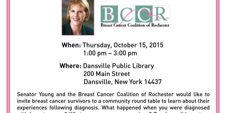 Senator Young and representatives from the BCCR will host a roundtable forum with survivors and their families to learn what support resources are available and what more can be done to assist those facing a breast cancer diagnosis. The forum will be held Thursday, October 15 from 1:00 – 3:00 p.m. at the Dansville Public Library, 200 Main Street in Dansville.