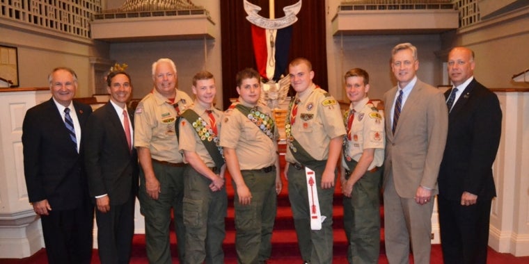 Senator Martins (second left) is pictured with (l-r), Nassau County Comptroller George Maragos, Troop 45 Scoutmaster Steve Grosskopf, Eagle Scout Stephen Martone, Eagle Scout Leonard Morra, Eagle Scout Theodore Bischoff, Eagle Scout George Becker, Nassau County Legislator Rich Nicolello, and Mineola Mayor Scott Strauss (not pictured: Nassau County Clerk Maureen O’Connell).
