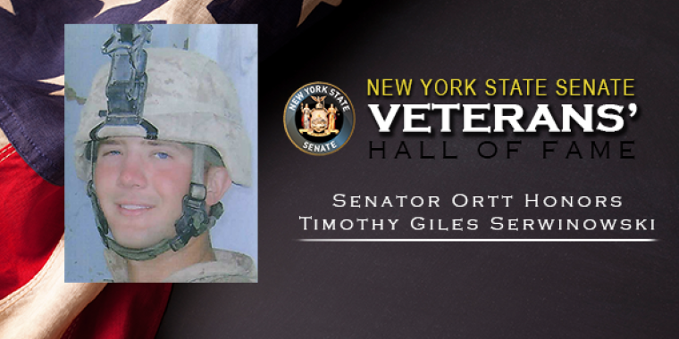 ALBANY - State Senator Rob Ortt (R,C,I – North Tonawanda) today honored Marine veteran and Purple Heart recipient Lance Corporal Timothy G. Serwinowski, and posthumously inducted him into the New York State Veterans' Hall of Fame during a ceremony at the Legislative Office Building.