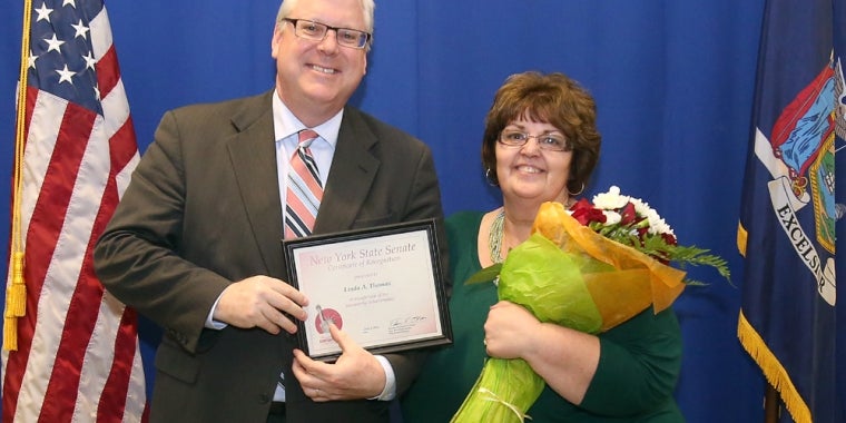 Albany, N.Y., May 6—State Senator Tom O’Mara (R-C, Big Flats) last night paid tribute to Linda Thomas, longtime owner and operator of the Wellsburg Diner in the village of Wellsburg, New York (Chemung County), as his 2015 “Woman of Distinction” at an awards ceremony in Albany.
