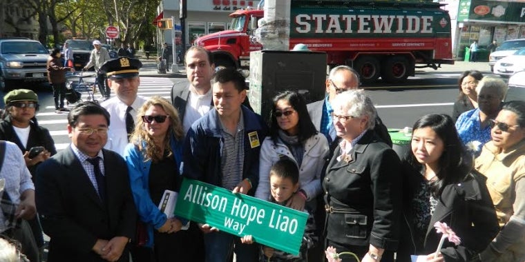 “There are no words to explain the grief felt when a parent loses a child; especially a child as young as Allison Hope Liao,” State Senator Toby Ann Stavisky (D-Flushing) said. “There is nothing I can say to reverse what happened to a little girl and her grandmother as they crossed the street. But we must make it a point to remember Allison and how preventable her death was. Pedestrians should not feel they are putting their lives on the line when they cross the street. With this street sign, we remember Allison, but we also remind ourselves of the terrible consequences of reckless driving. We must create safer roads for both drivers and pedestrians, so that what happened to Allison – and the hundreds of other people who died in New York City traffic – does not happen again.”
