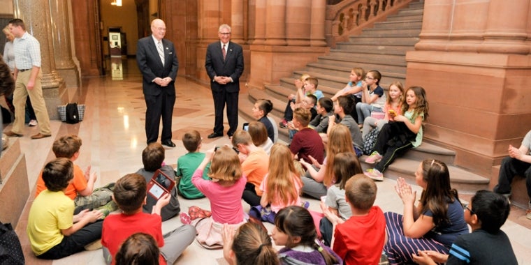 State Senator Hugh T. Farley (R, C, I – Schenectady) had the pleasure of meeting with students from Glen Worden Elementary School, Scotia-Glenville Central School District, on May 3rd when they came to Albany to visit the Capitol with their teachers Monica Allin and Marcia Smith. Assemblyman James Tedisco also visited with the students.