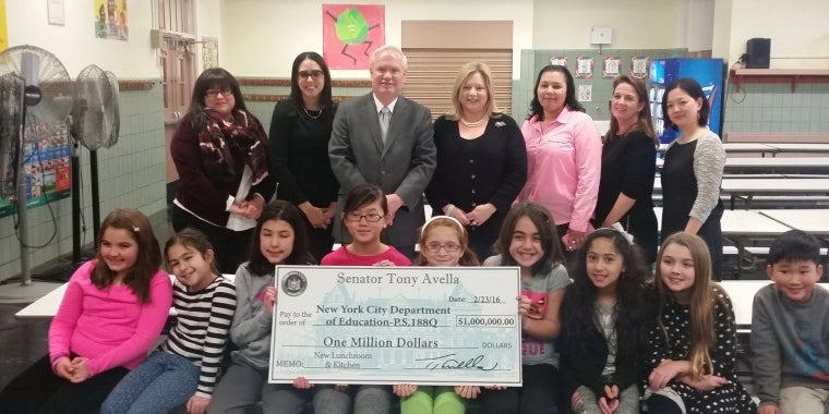 (Queens, NY) Today, State Senator Tony Avella presented a check for $1,000,000 to Principal Janet Caraisco for the construction of a new cafeteria at P.S. 188Q. Principal Caraisco received the check on behalf of the Department of Education, who will oversee the funding and the project’s construction.