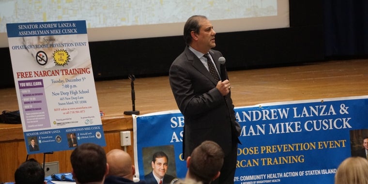 Assemblyman Mike Cusick said, “With the drug epidemic continuing to grow on Staten Island, it is essential that we equip our neighbors with the tools and knowledge on how to be proactive and save an individual who is experiencing an overdose. This training provides attendees with the knowledge of the dangers associated with these drugs, how to deter the start of drug usage, and how this epidemic not only affects the user but adversely affects family and friends as well. We must continue to educate the public of the harmful effects this epidemic causes and we must stand together in order to combat this disease. I want to thank my partners in government, particularly Senator Lanza, along with Community Health Action of Staten Island and our host, New Dorp High School.”