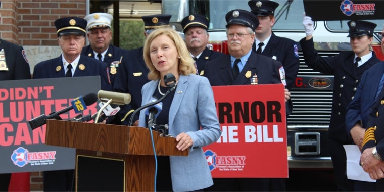 Earlier this fall Senator Elaine Phillips, joined by members of the Fireman’s Association of the State of New York (FASNY), the New York State Association of Fire Chiefs, the Association of Fire Districts of the State of New York, and local firefighters, called on the Governor to sign legislation that provides presumptive “gap” coverage to volunteer firefighters diagnosed with certain types of cancer.