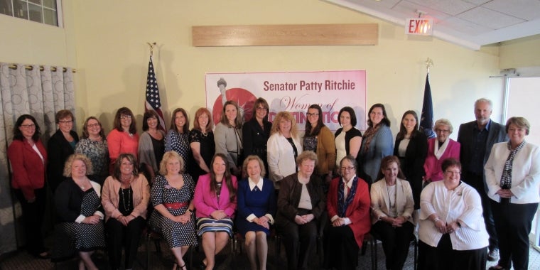 Pictured in the back row from left to right are: Patti Pastella, LouAnne King, Amy Austin, Michelle Capone, Rhonda Foote, Adrienne Alteri, Katherine Stackel, Pamela Caraccioli, Dr. Maja Gray, Kelly Flanagan-Hall, Sarah Cox, Caitlin Hill, Nicole Alman, Joey Marie Horton, Margaret Kastler (accepting on behalf of Marietta Holley), David Gardner (accepting on behalf of Bonnie (Austin) Gardner and Senator Patty Ritchie.