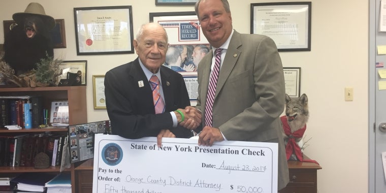 Senator Bill Larkin (R-C-I, 39th District) presented a ceremonial $50,000 check today to Orange County District Attorney David Hoovler at his office in Goshen, NY. This funding will be used toward law enforcement activities at the discretion of the District Attorney’s office.
