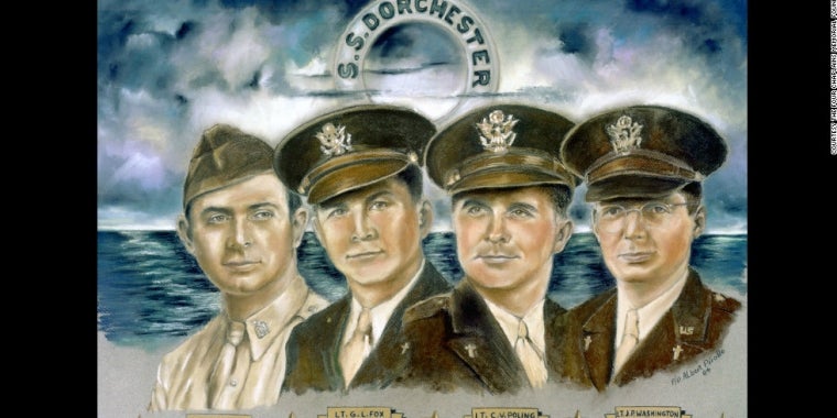On Board the USAT Dorchester, a transport ship that sank when it was hit by a German submarine JU -233, were four U.S. Army Chaplains who gave their lives to save other civilian and military personnel:
