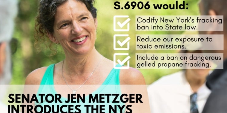 Today, on the five-year anniversary of New York State’s historic commitment to ban fracking, Senator Jen Metzger (SD-42) introduced a new bill (S6906) that permanently bans high-volume hydraulic fracturing and gelled propane fracking in New York. The existing ban on fracking, announced by Governor Cuomo and state health and environmental officials on December 17, 2014, was undertaken as a regulatory action by the NYS Department of Environmental Conservation. The legislation will give New York’s ban on fracking the permanence of law, and includes gelled propane fracking, a new and extremely dangerous process the oil and gas industry is proposing.
