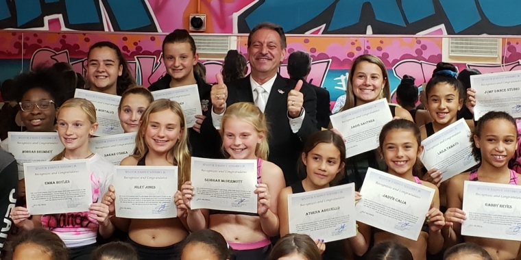 Last week, State Senator Joseph P. Addabbo, Jr. visited the dancers of the Jump Dance Studio in Rockaway to congratulate the girls on winning the Star Dance Alliance World Dance Championship by presenting them with Senate Citations.