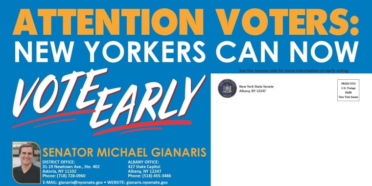 Senator Gianaris’ mailers tell voters the hours for early voting and their designated location, which differs from their Election Day poll site. Early voting will take place this year from October 26 through November 3. Voters must use their site as assigned by the Board of Elections. Assigned sites, as well as early voting hours, are also available on the Board of Elections website, www.vote.nyc.ny.us.