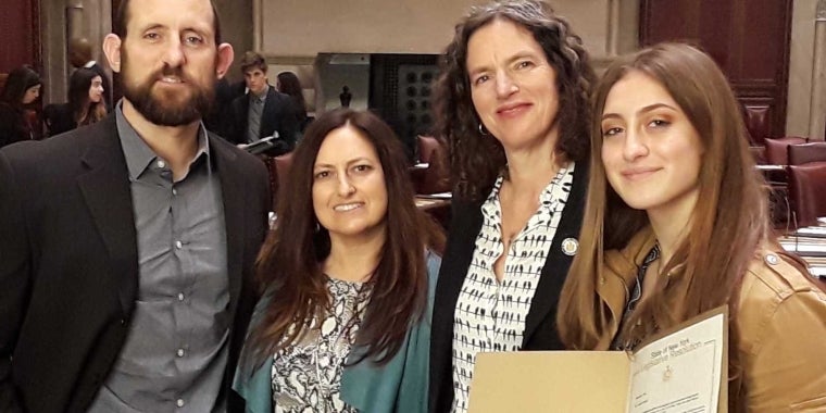 Albany, NY…On Monday, February 24, Senator Jen Metzger (SD-42) welcomed Minisink High School Sophomore Sofia Macaluso and parents Nikki and Heath Macaluso to the Senate Chambers for the adoption of a Senate Resolution honoring Sofia on her national wrestling championship win in the 122-pound division at the U.S. Marine Corps Cadet Women’s Freestyle this past summer.