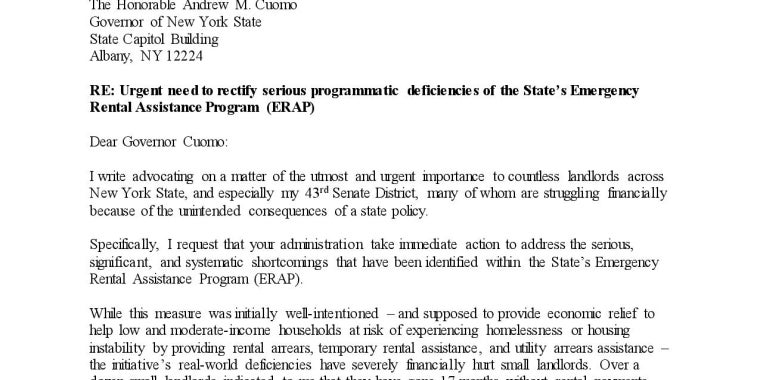 Today, NYS Senator Daphne Jordan wrote to Governor Cuomo urging his Administration to finally fix the problems with a state program that's supposed to be helping landlords. Senator Jordan shared in her letter that she has heard from countless landlords in her 43rd Senate District, and all across the state, regarding the financial devastation they are facing due to COVID-19, the economic downturn, and state programs that are hurting, not helping. Senator Jordan noted that landlords are small businesses, face incredible financial hardships and that some landlords have not been paid rent, or received state relief, for 17 months! You can read Senator Jordan's letter attached to this posting as a pdf.